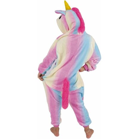 Легендарный! Этот костюм радужного единорога предназначен для детей. Он включает комбинезон с капюшоном. Комбинезон, сделанный из плюшевой ткани, окрашен в радужные пастельные тона. У него белый живот с пуговицами для легкого надевания и снимания. Капюшон представляет собой голову единорога с красивыми розовыми ушками и желтым рогом. Ваша дочь превратится в самого красивого единорога в этом костюме радужного единорога на карнавале или на вечеринке по случаю дня рождения в единороговой тематике. В комплект входят аксессуары: 1 комбинезон с капюшоном Материал: 100% полиэстер Уход: ручная стирка