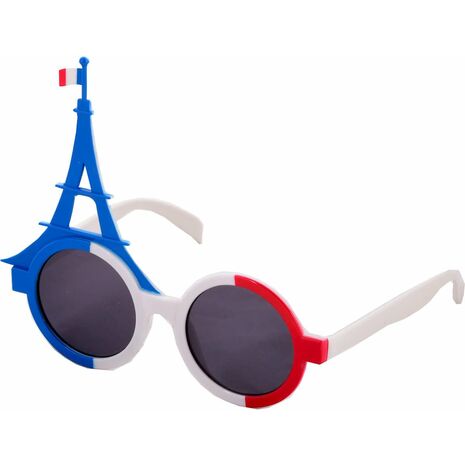 Очки во французском стиле! Эти очки для поддержки Эйфелевой башни Франции предназначены для взрослых. Они круглые, а оправа выполнена в цветах французского флага: синий, белый, красный. Она увенчана синей Эйфелевой башней, украшенной трехцветным флагом. Линзы тонированы черным. Эта пара очков для поддержки Эйфелевой башни Франции идеально подойдет для празднования национального спортивного соревнования или по случаю 14 июля!. Аксессуары в комплекте: Очки