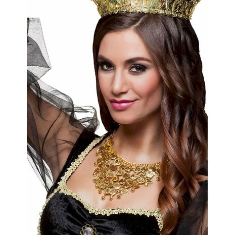 Чтобы завершить ваш костюм восточной танцовщицы. Это ожерелье сделано из позолоченного металла и имеет длину около 49 см. Для взрослых оно состоит из маленьких золотых монет и колокольчиков.   Дополните свой костюм восточной танцовщицы этим необходимым аксессуаром для одной из ваших костюмированных вечеринок. В комплект входят аксессуары: Материал ожерелья: металл