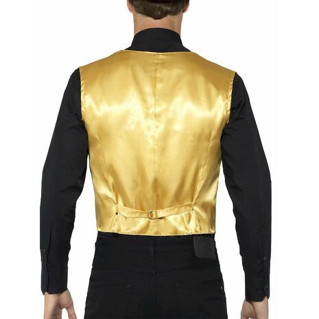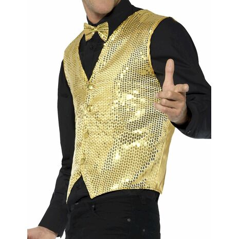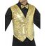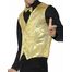Золотые пайетки! Этот жилет с золотыми пайетками предназначен для мужчин (в комплект входит только жилет). На передней части жилета есть пайетки, на задней части ткань - золотой атлас. 4 пуговицы прикрепляют жилет спереди. На нем также есть две завязки с пряжкой сзади, чтобы можно было застегнуть его сзади. Этот жилет идеально подходит для завершения костюма с пайетками для вечеринки в стиле диско или чарльстона. Аксессуары в комплекте: Материал жилета: 100% полиэстер Уход: ручная стирка