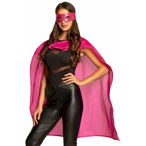 Одягніться супергероєм миттєво. Цей рожевий комплект супергероя призначений для дорослих. Він складається з маски та плаща. Довжина довгого плаща становить приблизно 90 см. Він застібається на липучку спереду. Маска зав'язується навколо голови. Цей комплект ідеально підходить для швидкого перетворення на супергероя чи супергероїню. Аксесуари в комплекті: Маска-плащ. Матеріал: 95% поліестер, 5% EVA. Догляд: Ручне прання.