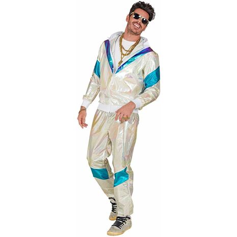 Ідеальний костюм для вашої вечірки в стилі 80-х! Оберіть яскравий костюм для вашої наступної костюмованої вечірки або для відвідування ретро-фестивалю. Пориньте у 80-ті та яскраво сяйніть у повсякденному вбранні! Цей голографічний спортивний костюм для дорослих включає куртку та штани. Костюм білий з широкими синіми смужками та голографічним ефектом. Куртка та штани мають білу гумку на зап'ястях, щиколотках та талії. Куртка має блискавку, що дозволяє легко її застібати. Не вагайтеся доповнити свій костюм, щоб справити фурор на вечірці, нашим широким вибором аксесуарів у стилі 80-х, таких як флуоресцентні окуляри, ювелірні вироби або навіть сумка у формі банана. Ретро-перука додасть завершальний штрих вашому вбранню. Цей голографічний спортивний костюм ідеально підійде, щоб вразити ваших друзів на вашій тематичній вечірці!. Аксесуари в комплекті: Куртка, штани. Матеріал: 100% поліестер. Догляд: Ручне прання.