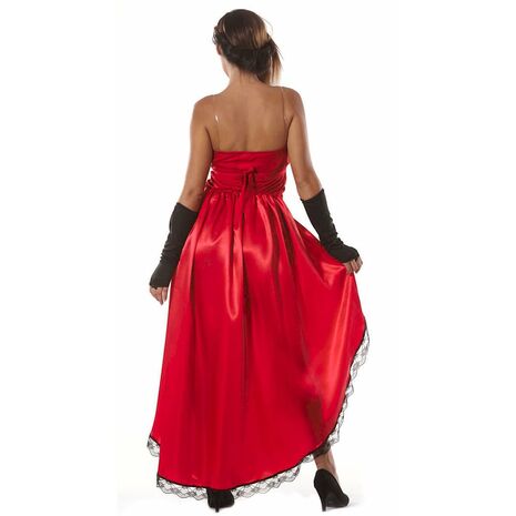 Салунна танцівниця! Цей костюм бурлеску для жінок складається із сукні та манжетів (намисто та колготки не входять до комплекту). Червона сукня з чорним мереживом має верх-бюстьє. Вона асиметрична, дуже коротка спереду, а ззаду до ніг тягнеться довгий шматок тканини. Вбрання доповнюють чорні манжети, що кріпляться до пальців. З цим костюмом танцівниці бурлеску, чи то для кабаре, чи для вестерн-вечора, ви будете неперевершені. Аксесуари в комплекті: Манжети сукні. Матеріал: 100% поліестер. Догляд: Ручне прання.