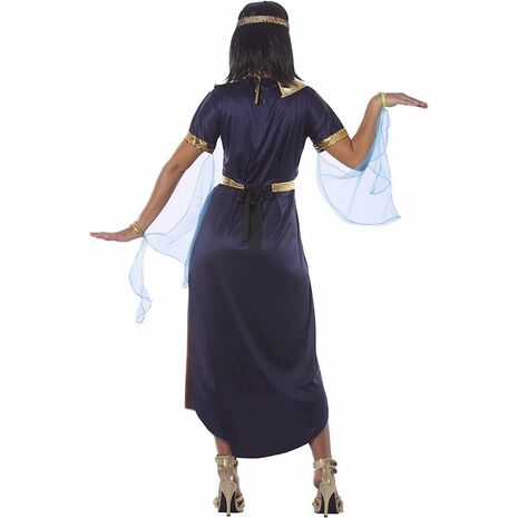 Прекрасна Клеопатра. Цей костюм єгипетської цариці призначений для жінок. Він включає чокер, сукню з рюшами та пояс. Сукня чорного кольору із золотими манжетами на рукавах. Золото-червоний чокер щойно одягнений на сукню, щоб завершити цю єгипетську сукню. Напівпрозора блакитна вуаль, прикріплена до плечей і з'єднана з тканинним браслетом, додасть повноти вашим рухам. Також додається пояс, що пасує до чокера. Він розміщується на талії, щоб стягувати сукню. У цьому костюмі єгипетської цариці ви будете найкрасивішою на ваших костюмованих вечірках на тему античності. Аксесуари в комплекті: Шия, сукня з рюшами. Матеріал пояса: 100% поліестер.