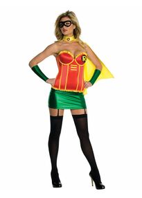 Красива блискуча тканина! Цей костюм Робіна™ для жінок офіційно ліцензовано. Він складається з сукні з накидкою, пояса, манжет і дзиги (туфлі та намисто в комплект не входять). Коротка і сексуальна сукня кольору зеленого та червоного металіка. Воно має короткі рукави та логотип знаменитого нерозлучного друга Бетмена™. Накидка з'єднана із сукнею. Вовк, жовтий пояс та манжети, такі ж, як у Робіна™, доповнюють цей костюм. Одягнений у цей костюм Робіна™, Ви станете сенсацією на маскарадній вечірці чи карнавалі.